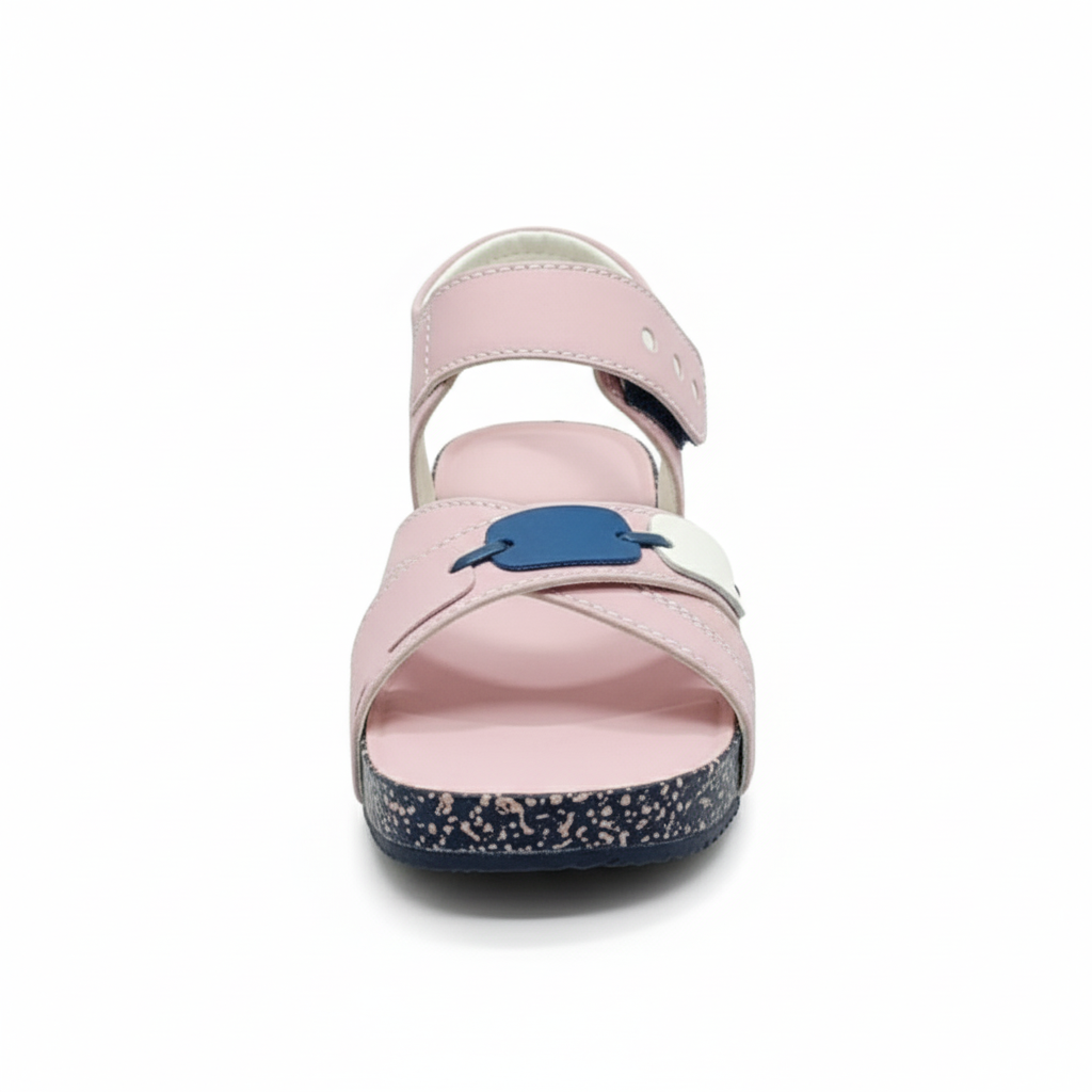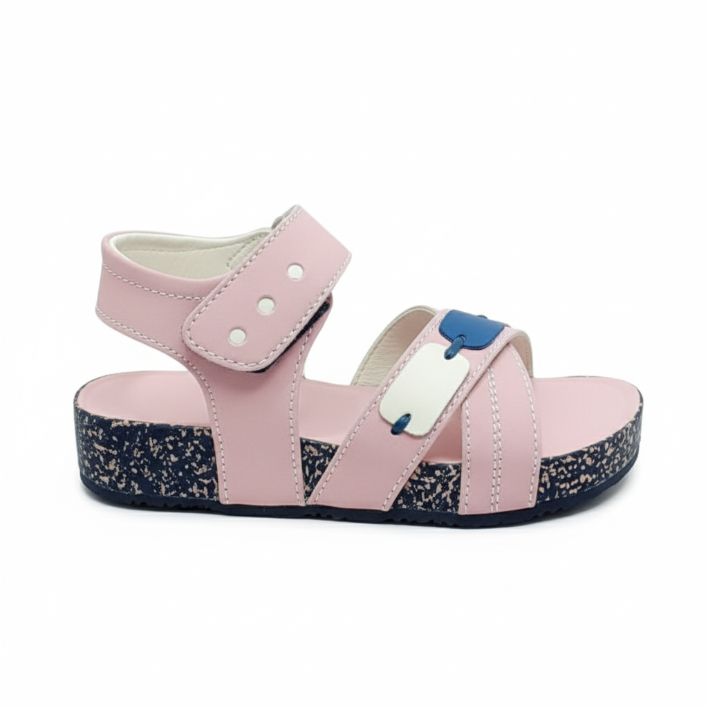 His sandal is designed for comfort and durability, featuring two adjustable Velcro straps for a secure fit. The soft and breathable upper is paired with a cork-style sole, ensuring a comfortable walking experience. Perfect for casual outings, this sandal offers both style and practicality for kids.