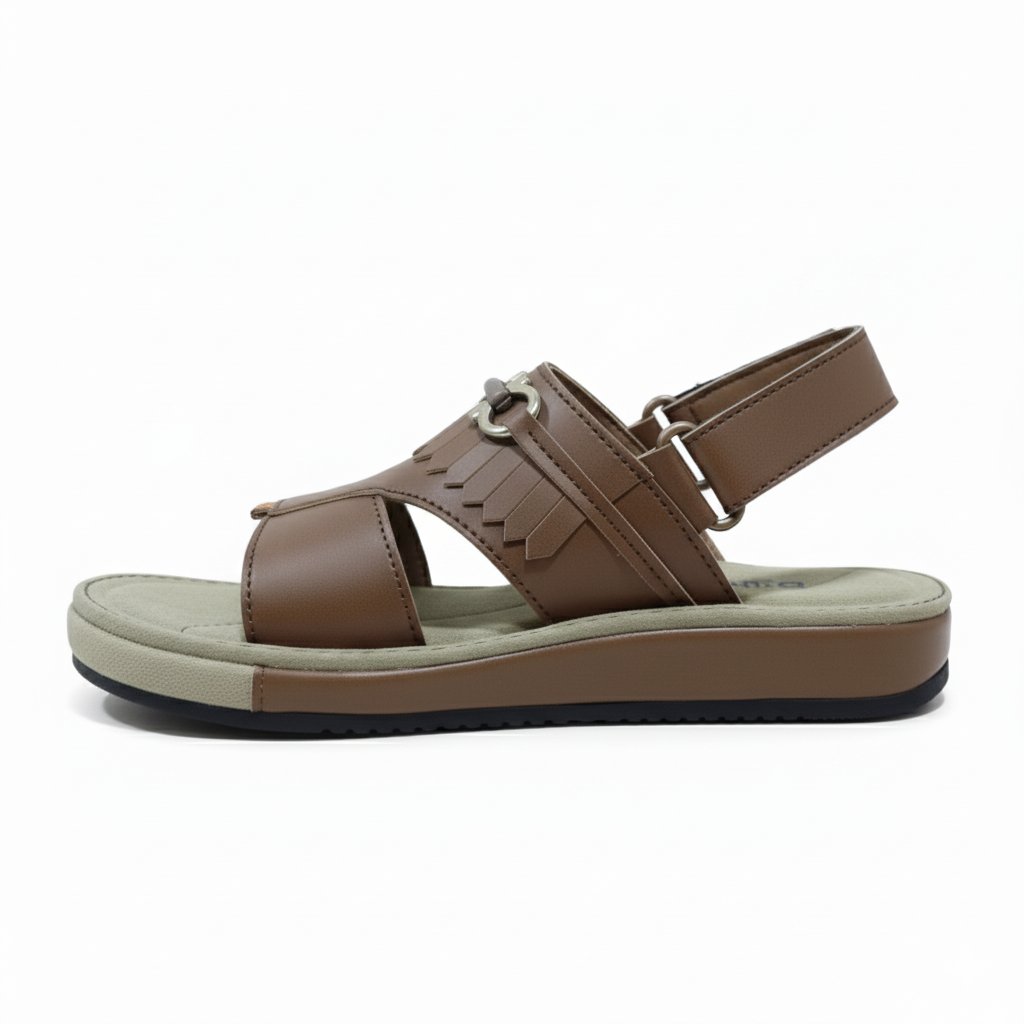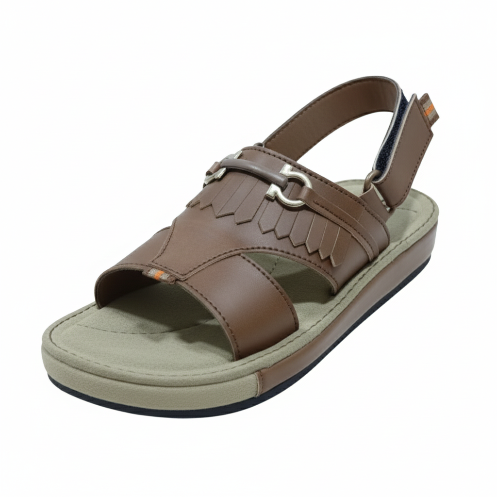 Stylish brown kids sandal features a trendy fringe design with a metallic buckle detail for a modern touch. The adjustable strap ensures a secure fit, and the soft sole provides comfort throughout the day. A perfect choice for casual outings, combining both style and functionality.