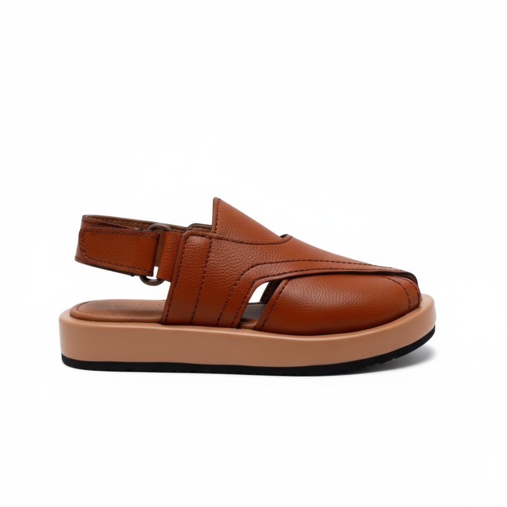 Toddler caramel peshawari chappal is designed with a smooth upper finish and a flexible grip sole for carefree steps. The open front style ensures ventilation, while the back strap secures the fit. A fashionable yet practical choice, ideal for festive occasions, outdoor play, and family gatherings across Pakistan cultural settings.
